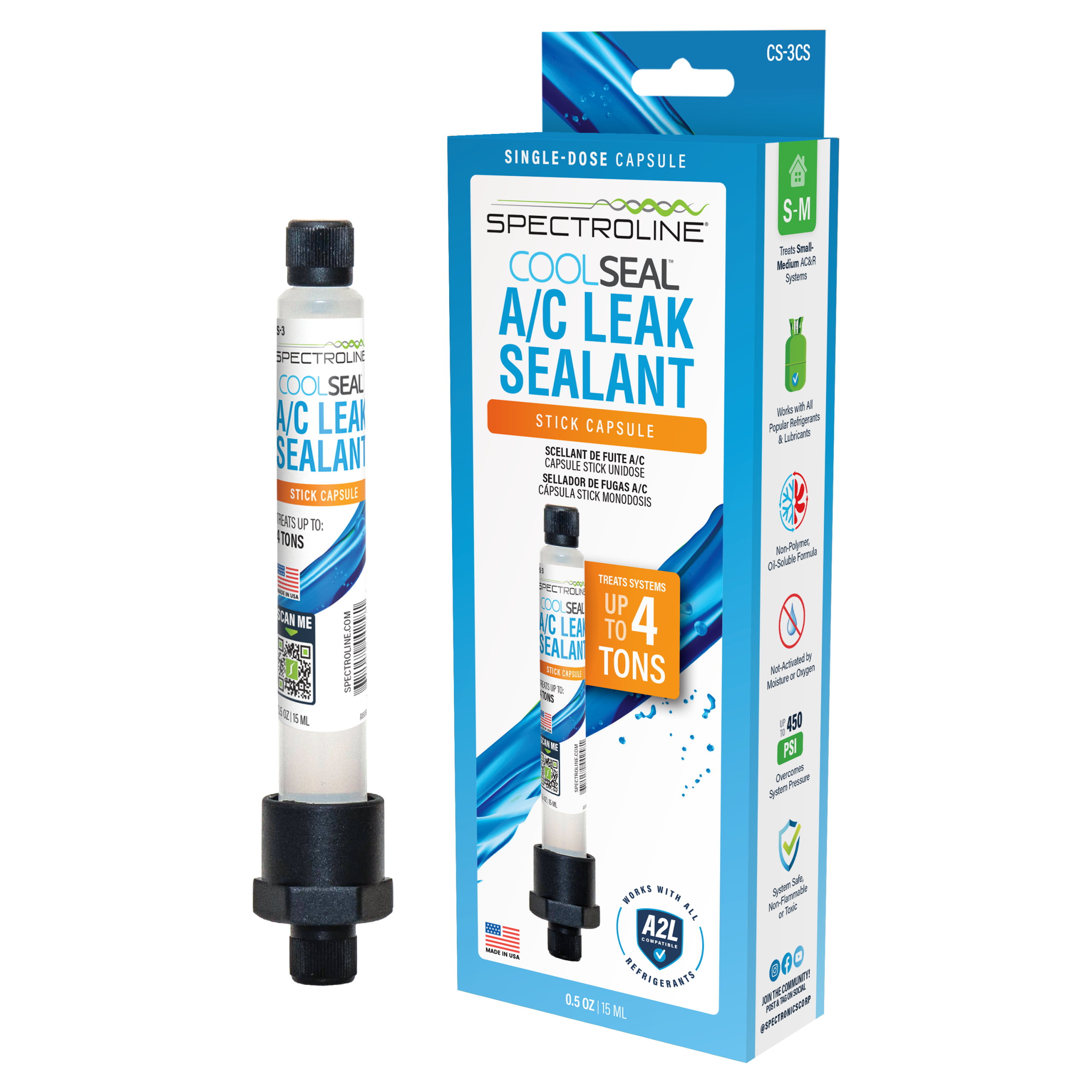 Spectroline COOL SEAL™ A/C Leak Sealant STICK Cartridge (CS-3CS) is designed for use with STICK-style injection tools, providing a clean and sealed method of applying leak sealant.
