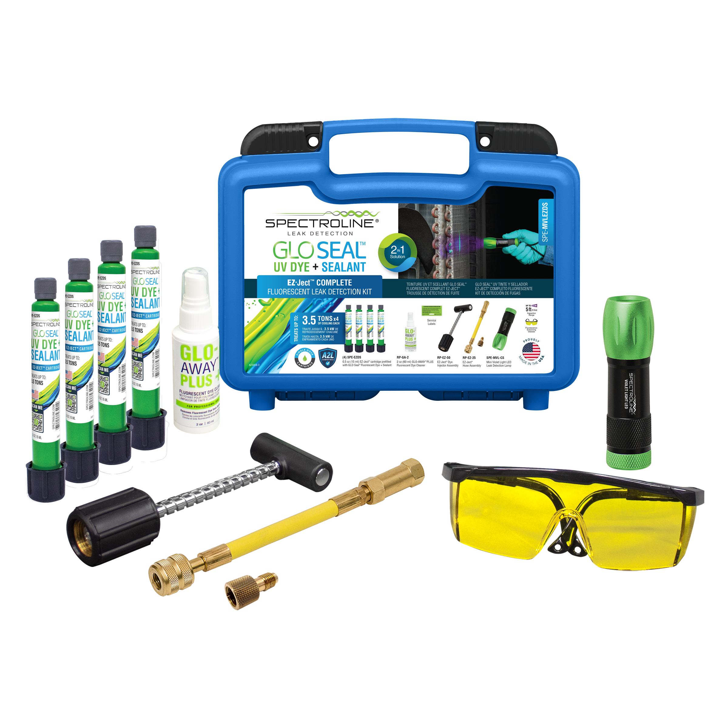 This kit combines the EZ-Ject™ injection system with a mini UV LED leak detection lamp, allowing technicians to inject dye and sealant and immediately verify leaks during the same service visit. Its compact size makes it ideal for mobile technicians and routine service calls.